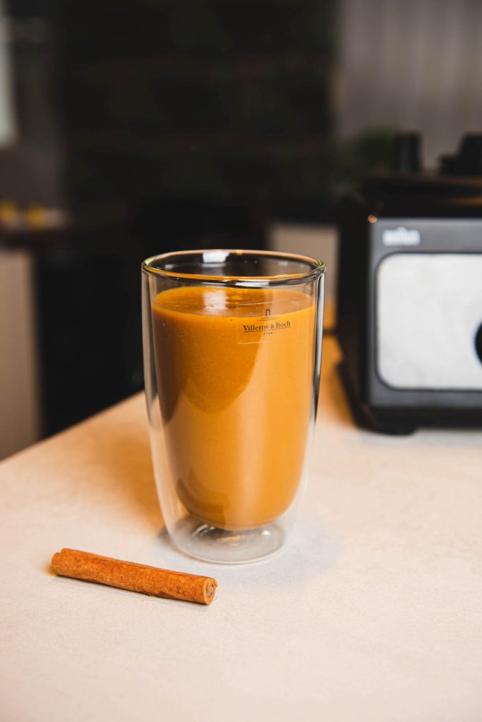 - A növényi tejet, az eszpresszót és a sütőtökpürét egy kelyhes turmixgépbe tesszük.